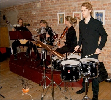 Carolin Bengtsson flöjt, Mattias Eklund basklarinett, Martin Hultkvist trombon, Josep Cusó tenor, Anette Hall accordeon, Niklas Bennerholm slagverk, Malin Lund violin and Jesper Andersson kontrabas